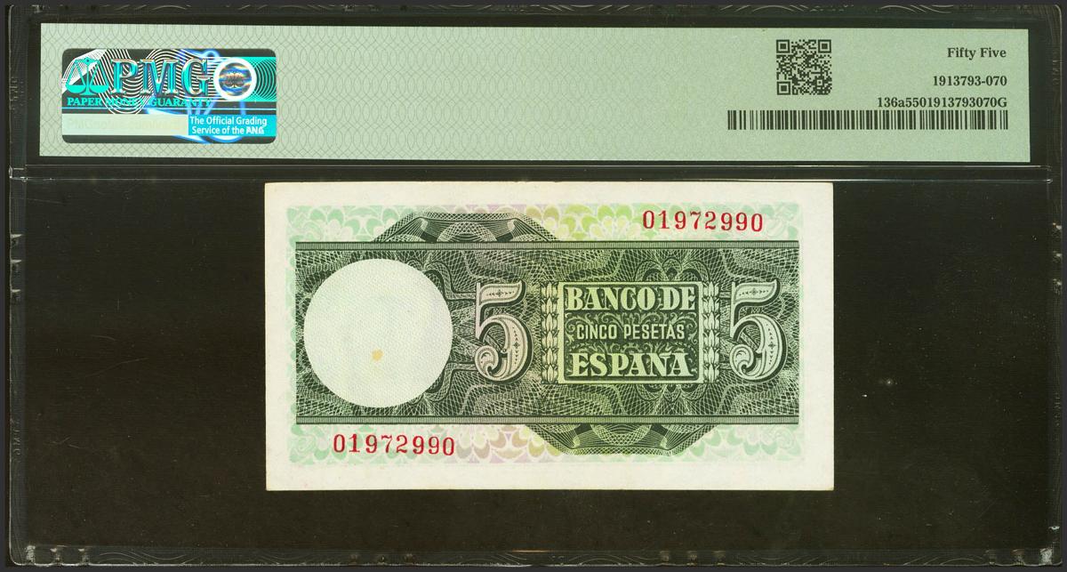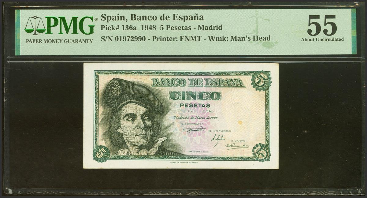 5 Pesetas. 15 de Marzo de 1948. Sin serie. (Edifil 2021: 455, Pick: 136a). Inusual en esta calidad. EBC+. Encapsulado PMG55.