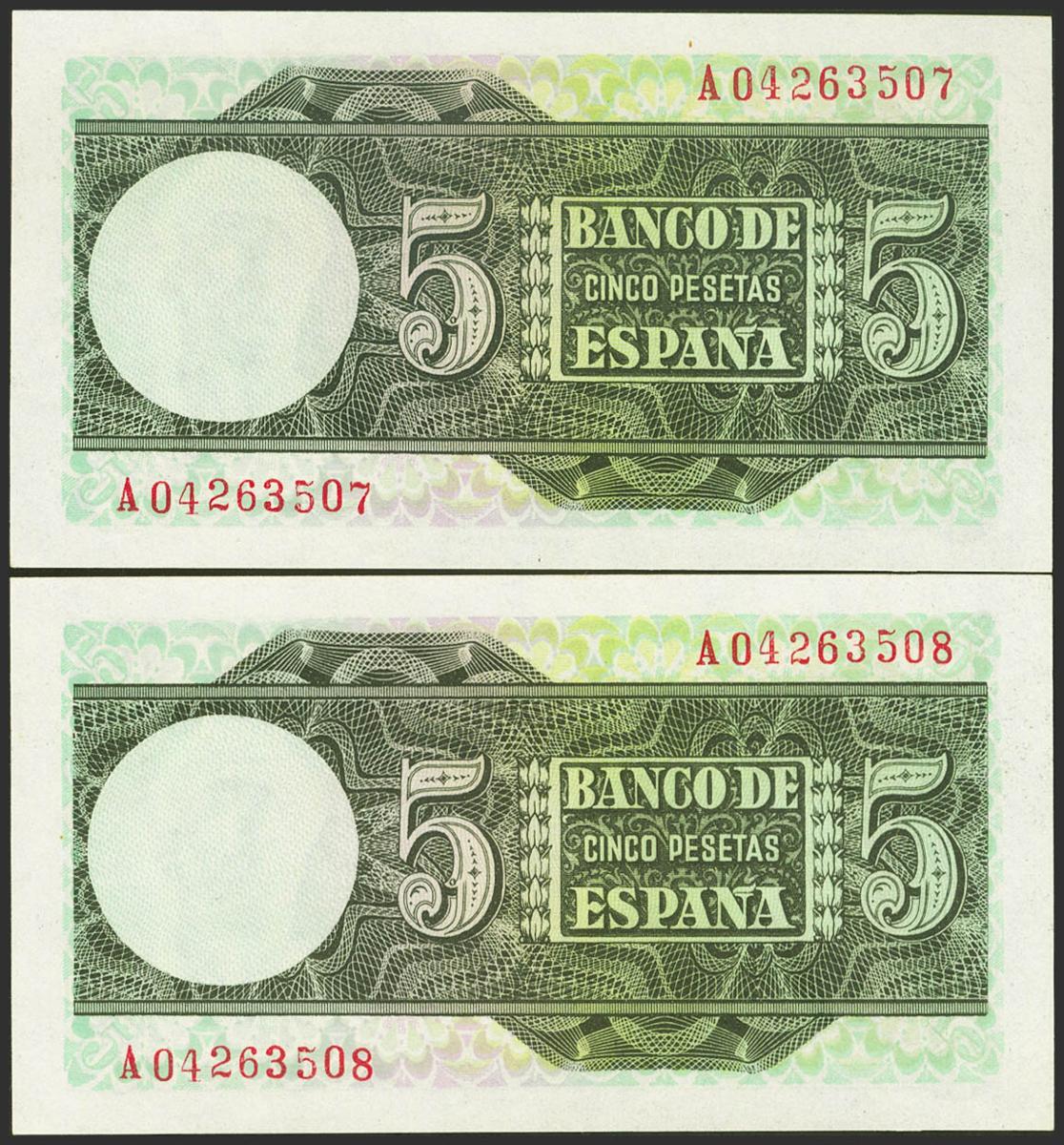 5 Pesetas. 5 de Marzo de 1948. Pareja correlativa. Serie A. (Edifil 2021: 455a). Apresto original. SC.