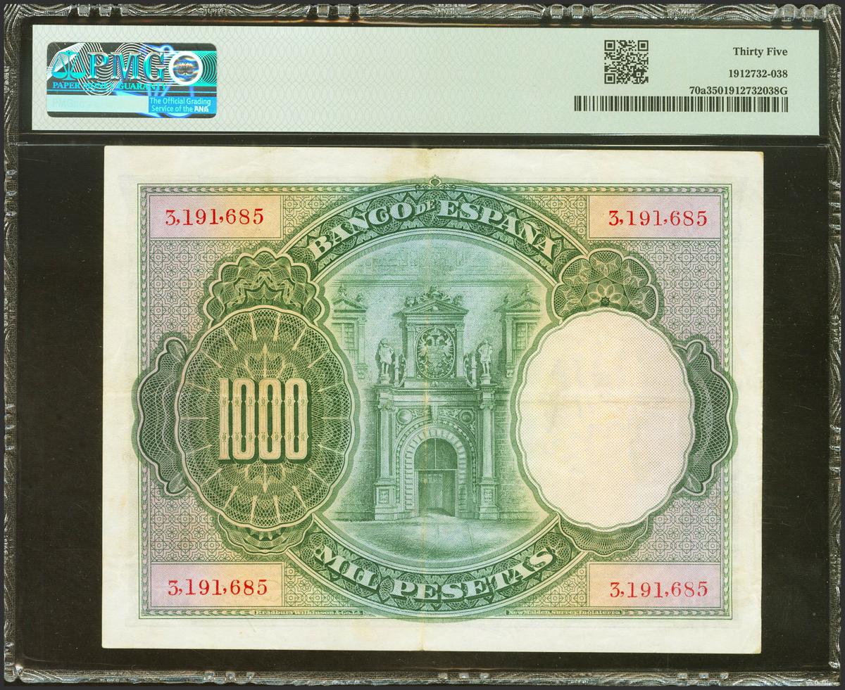 1000 Pesetas. 1 de Julio de 1925. Sin serie y numeración anterior a 3646000 (esta numeración es más rara). (Edifil 2021: 324, Pick: 70a). MBC+. Encapsulado PMG35.
