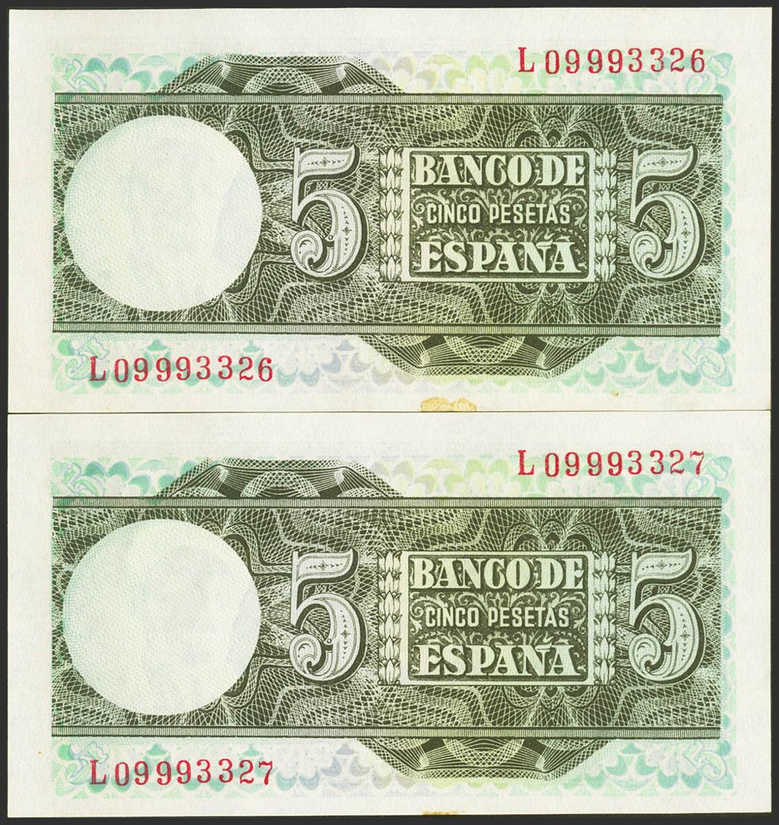 5 Pesetas. 5 de Marzo de 1948. Pareja correlativa. Serie L. (Edifil 2021: 455a). Apresto original, manchita en el margen inferior. EBC+++.
