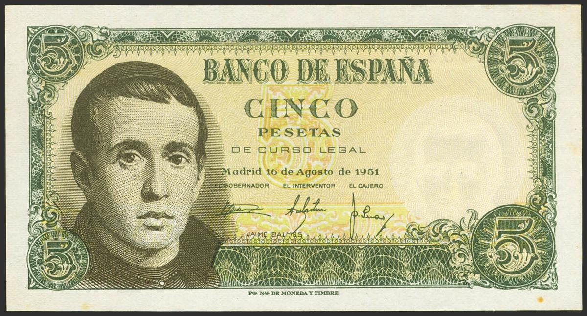 5 Pesetas. 16 de Agosto de 1951. Serie J. (Edifil 2021: 459a). Apresto original y manchitas del tiempo. SC.
