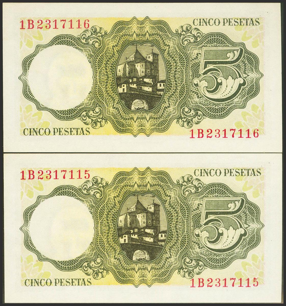 5 Pesetas. 16 de Agosto de 1951. Pareja correlativa. Serie 1B. (Edifil 2021: 459a). Apresto original. SC.