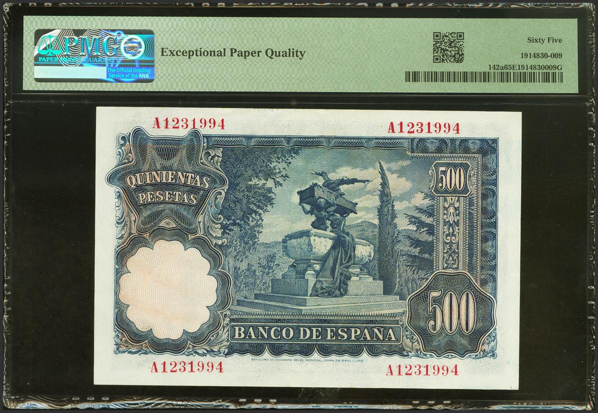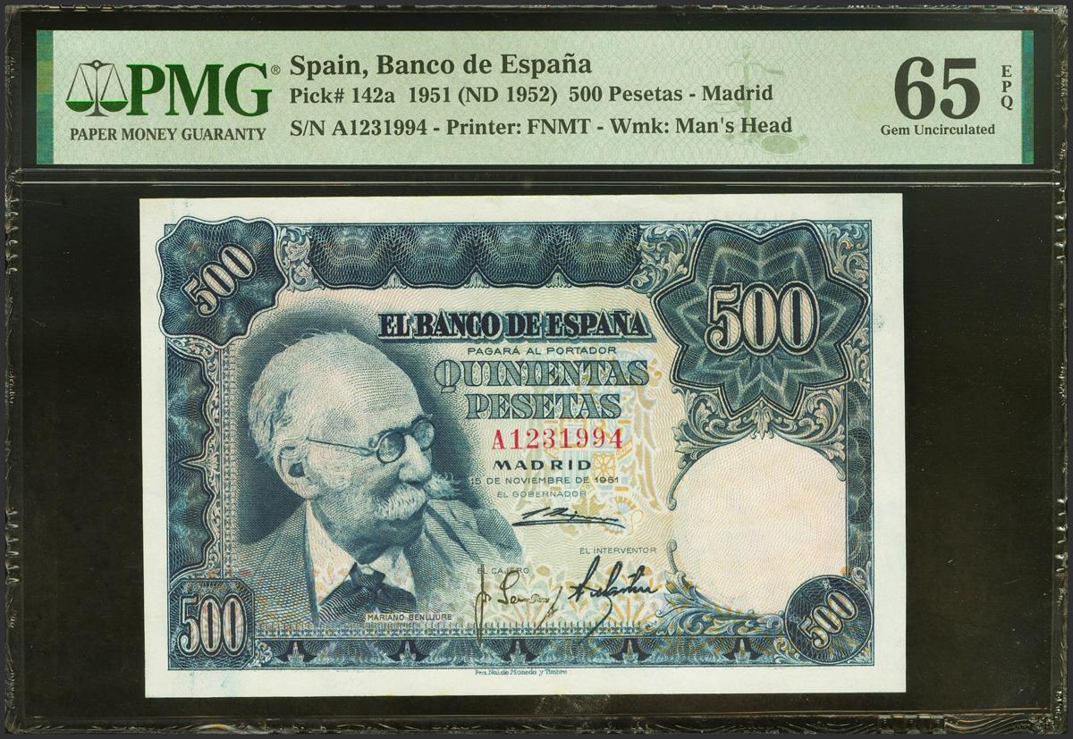 500 Pesetas. 15 de Noviembre de 1951. Serie A. (Edifil 2021: 460a). Inusual en esta calidad, conserva todo su apresto original. SC. Encapsulado PMG65EPQ.