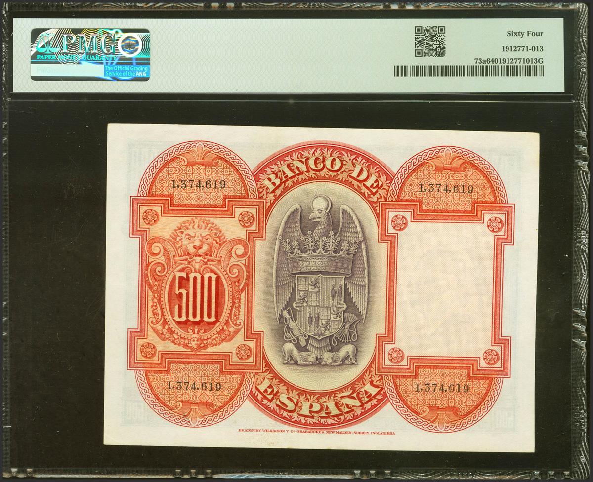 500 Pesetas. 24 de Julio de 1927. Sin serie y numeración anterior al 1602000. (Edifil 2021: 327, Pick: 73a). Rarísimo en esta calidad, especialmente con la numeración de Alfonso XIII, conserva todo su apresto original. SC. Encapsulado PMG64.