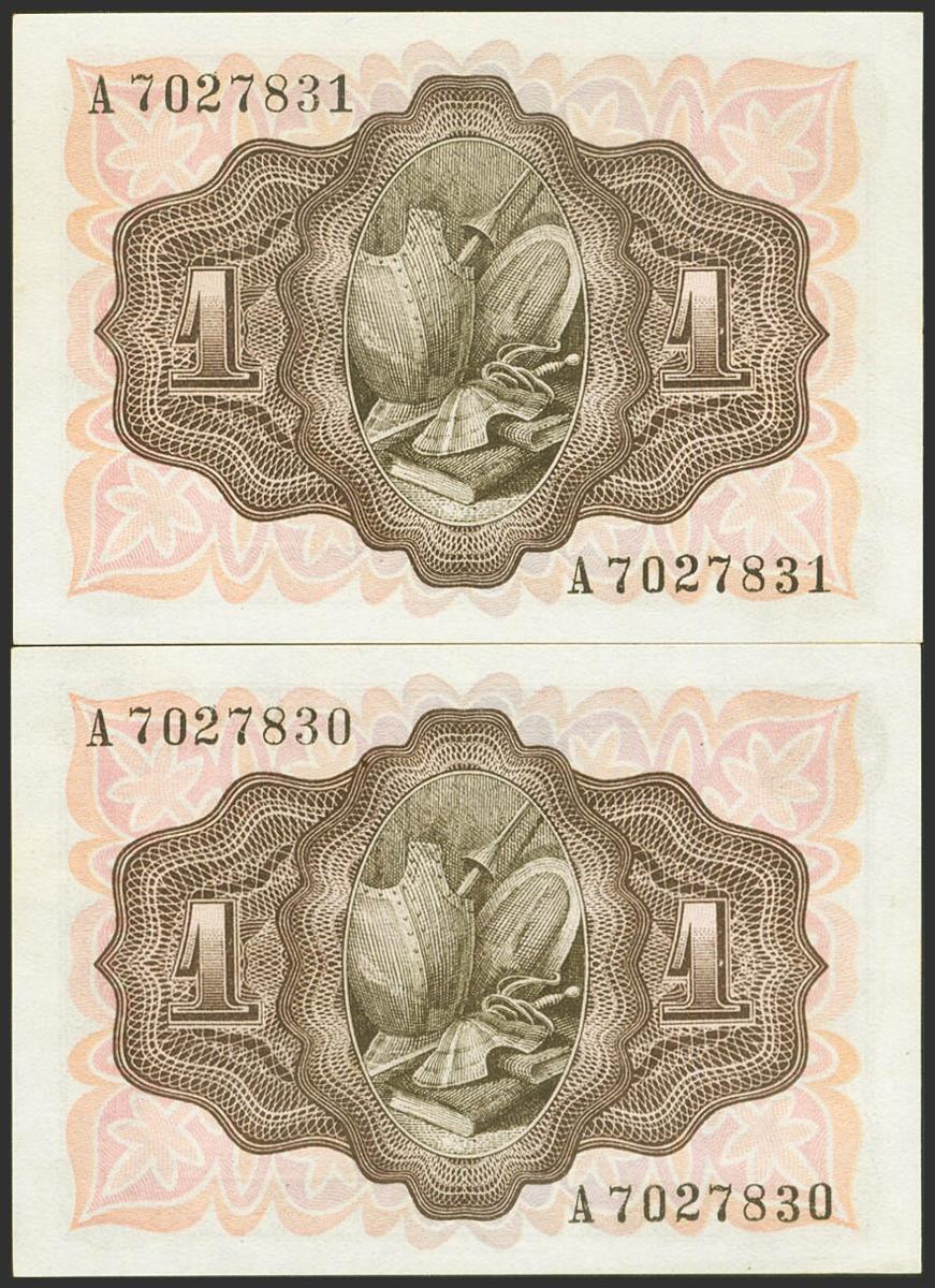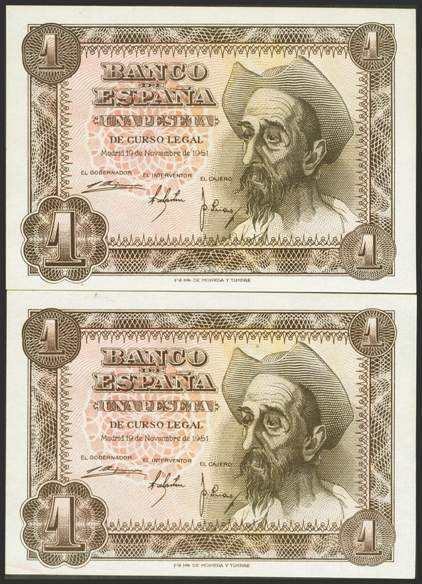 1 Peseta. 19 de Noviembre de 1951. Pareja correlativa. Serie A. (Edifil 2021: 461a). Apresto original. SC-.