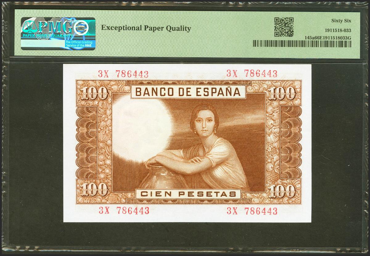 100 Pesetas. 7 de Abril de 1953. Serie 3X, última serie emitida. (Edifil 2021: 464c, Pick: 145a). Muy raro en esta excepcional calidad. Apresto original. SC. Encapsulado PMG66EPQ.