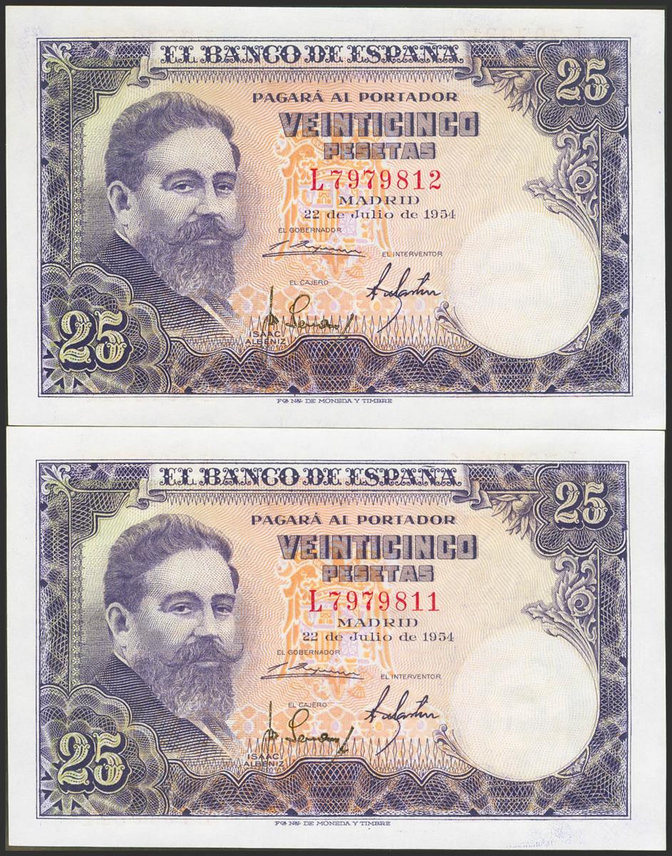 25 Pesetas. 22 de Julio de 1954. Pareja correlativa. Serie L. (Edifil 2021: 467a). Apresto original. SC.
