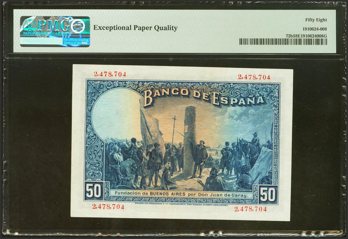 50 Pesetas. 17 de Mayo de 1927. Sin serie y sello en seco "Gobierno Provisional de la República / 14 Abril 1931". (Edifil 2021: 339, Pick: 72b). Raro en esta calidad, apresto original. EBC+++. Encapsulado PMG58EPQ.