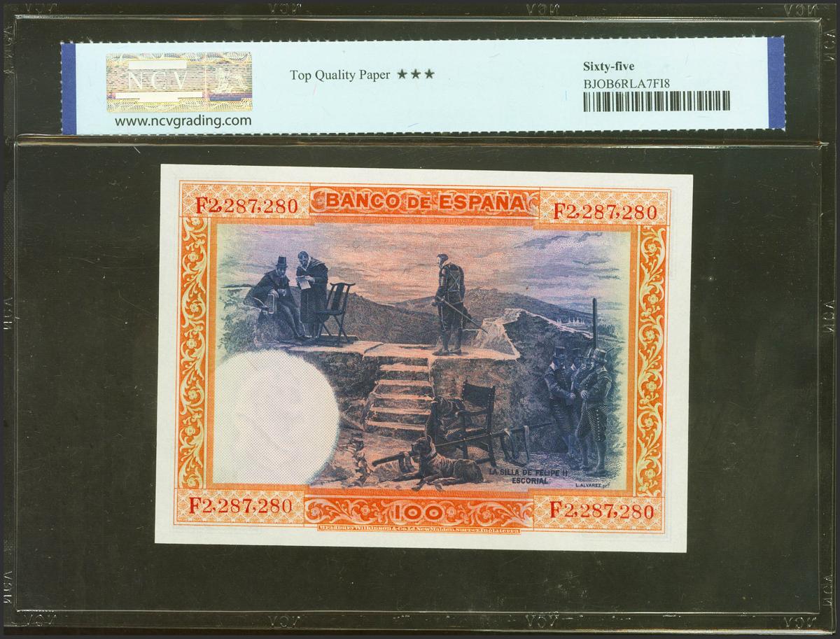 100 Pesetas. 1 de Junio de 1925. Serie F. (Edifil 2021: 350, Pick: 69c). Apresto original SC. Encapsulado NCV65TQP.