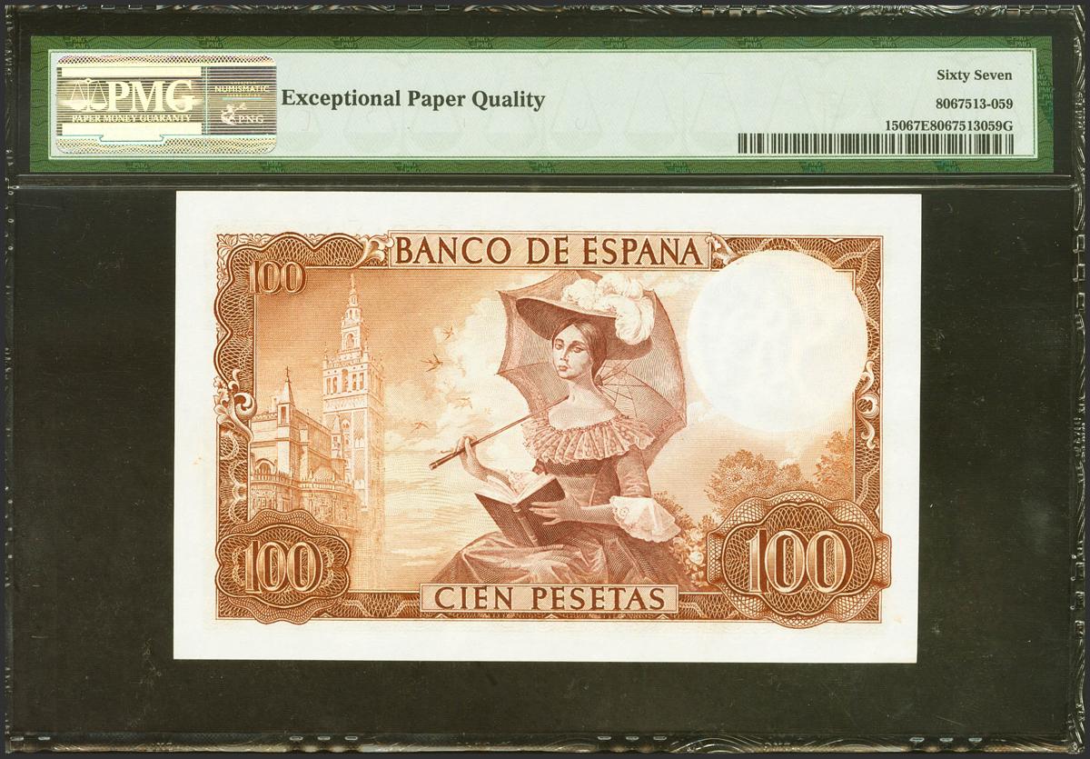 100 Pesetas. 19 de Noviembre de 1965. Sin serie. (Edifil 2021: 470, Pick: 150). Apresto original. SC. Encapsulado PMG67EPQ.