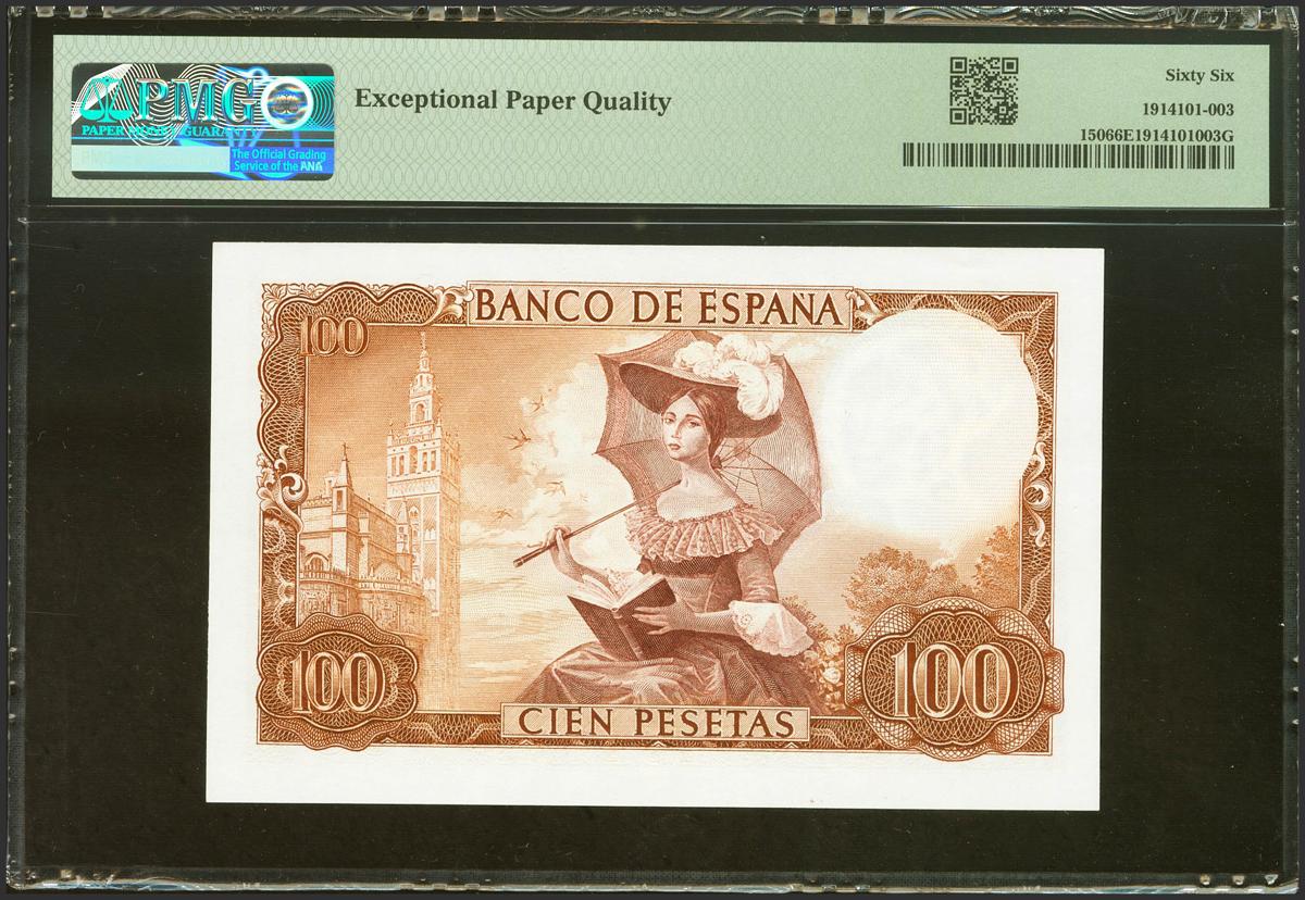 100 Pesetas. 19 de Noviembre de 1965. Sin serie. (Edifil 2021: 470, Pick: 150). Inusual en esta excepcional calidad, apresto original. SC. Encapsulado PMG66EPQ.