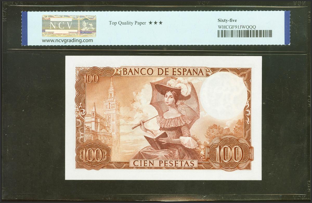 100 Pesetas. 19 de Noviembre de 1965. Sin serie. (Edifil 2021: 470a, Pick: 150). Raro en esta excepcional calidad, apresto original. Encapsulado NCV65TQP.