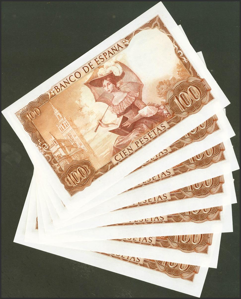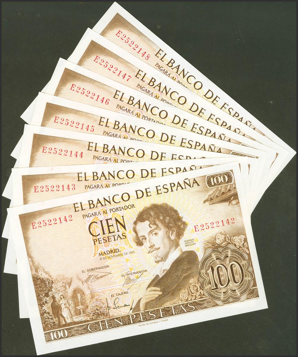 Conjunto de 7 billetes correlativos de 100 Pesetas, emitidos el 19 de Noviembre de 1965, todos ellos con la serie E (Edifil 2021: 470a), conservando su apresto original. SC/SC-.