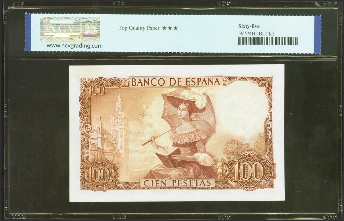 100 Pesetas. 19 de Noviembre de 1965. Serie 1I. (Edifil 2021: 470a, Pick: 150). Raro en esta excepcional calidad, apresto original. Encapsulado NCV65TQP.