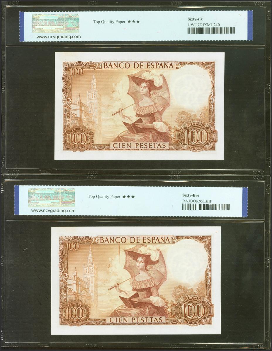 100 Pesetas. 19 de Noviembre de 1965. Pareja correlativa. Serie 1I. (Edifil 2021: 470a, Pick: 150). Apresto original. Encapsulado NCV65TQP/66TQP.