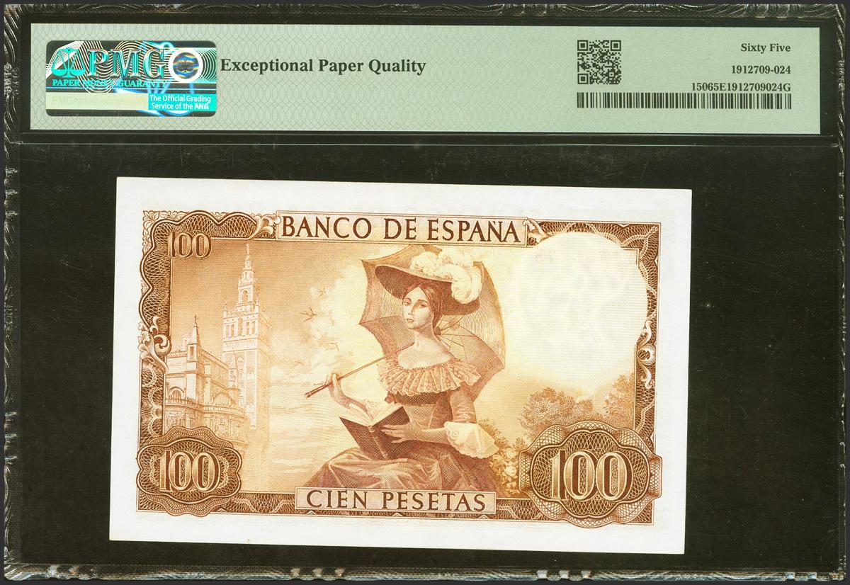 100 Pesetas. 19 de Noviembre de 1965. Serie 1T, última serie emitida. (Edifil 2021: 470a, Pick: 150). Inusual, apresto original. SC. Encapsulado PMG65EPQ.