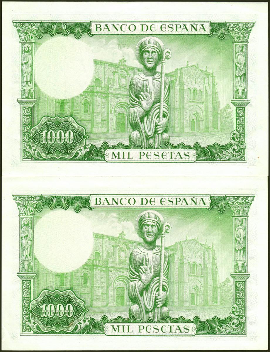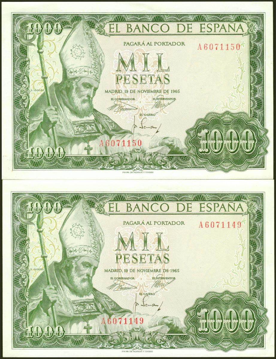 1000 Pesetas. 19 de Noviembre de 1965. Pareja correlativa. Serie A. (Edifil 2021: 471a). Conserva todo su apresto original. SC--.