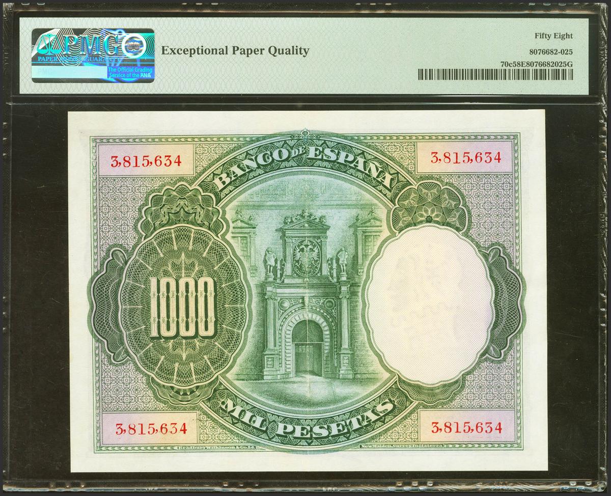 1000 Pesetas. 1 de Julio de 1925. Sin serie y numeración posterior al 3646000. (Edifil 2021: 351, Pick: 70c). Inusual en esta calidad, apresto original. EBC+++. Encapsulado PMG58EPQ.