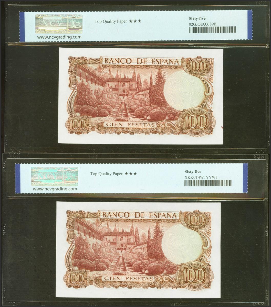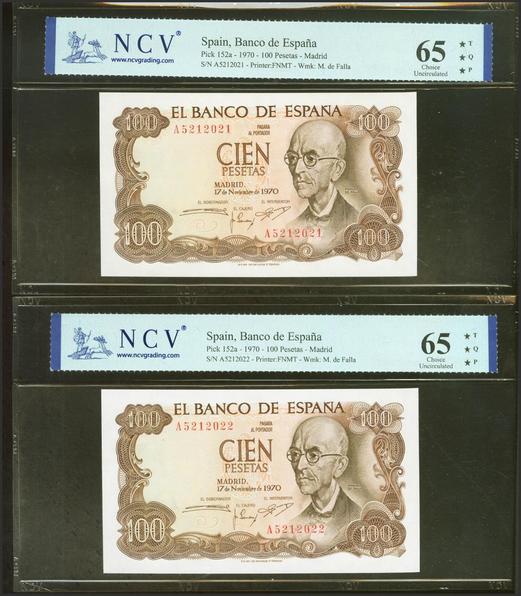 100 Pesetas. 17 de Noviembre de 1970. Pareja correlativa. Serie A. (Edifil 2021: 472a). Apresto original. Encapsulado NCV65TQP.