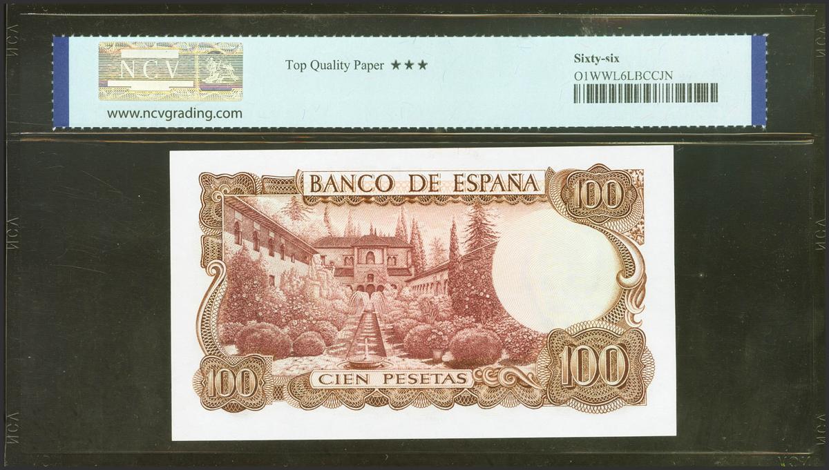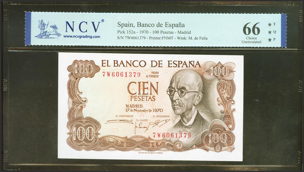 100 Pesetas. 17 de Noviembre de 1970. Serie 7W, última serie emitida. (Edifil 2021: 472c, Pick: 152a). Apresto original. SC. Encapsulado NCV66TQP.