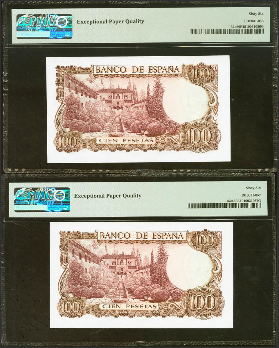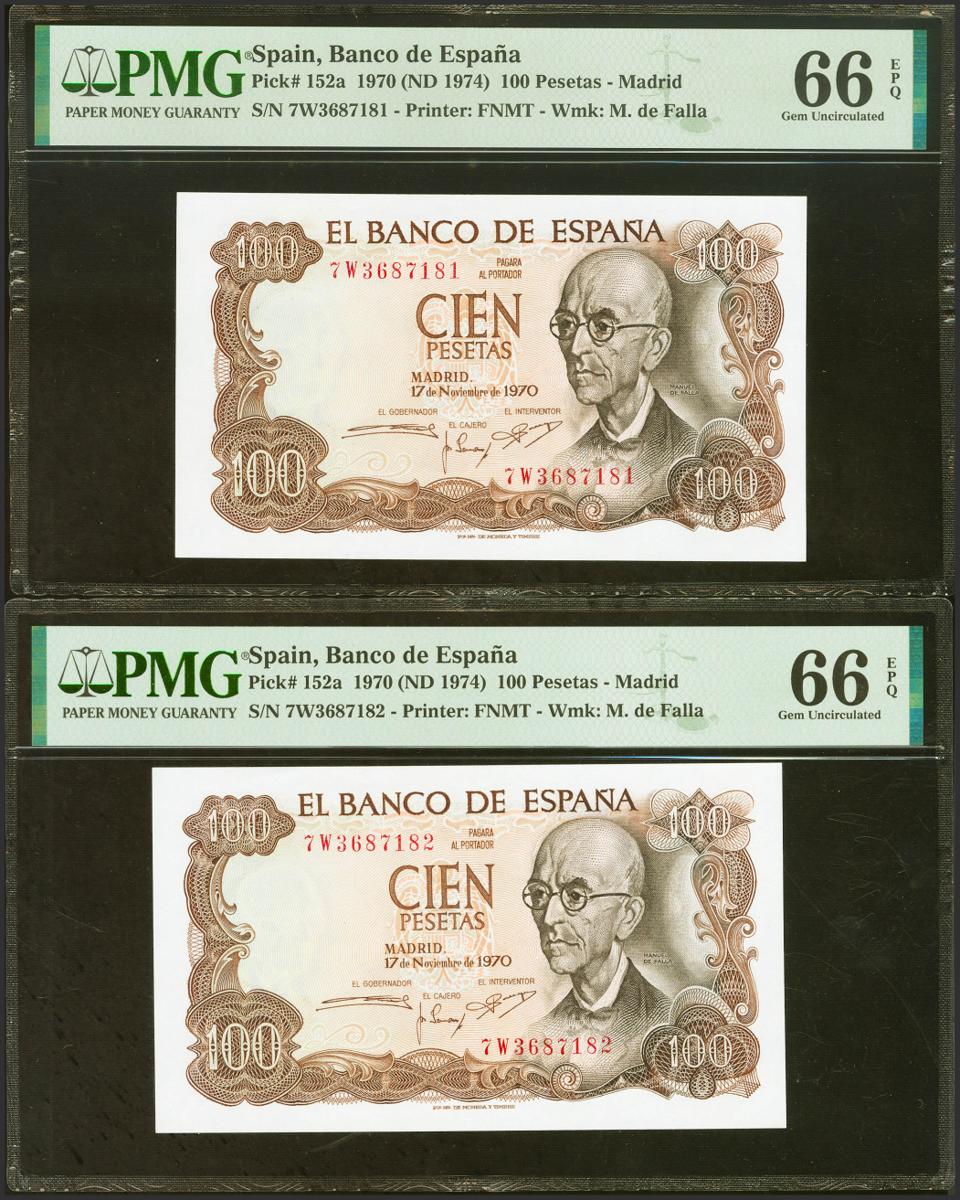 100 Pesetas. 17 de Noviembre de 1970. Pareja correlativa. Serie 7W, última serie emitida. (Edifil 2021: 472c, Pick: 152a). Inusual en esta excepcional calidad, apresto original. SC. Encapsulado PMG66EPQ, ambos.
