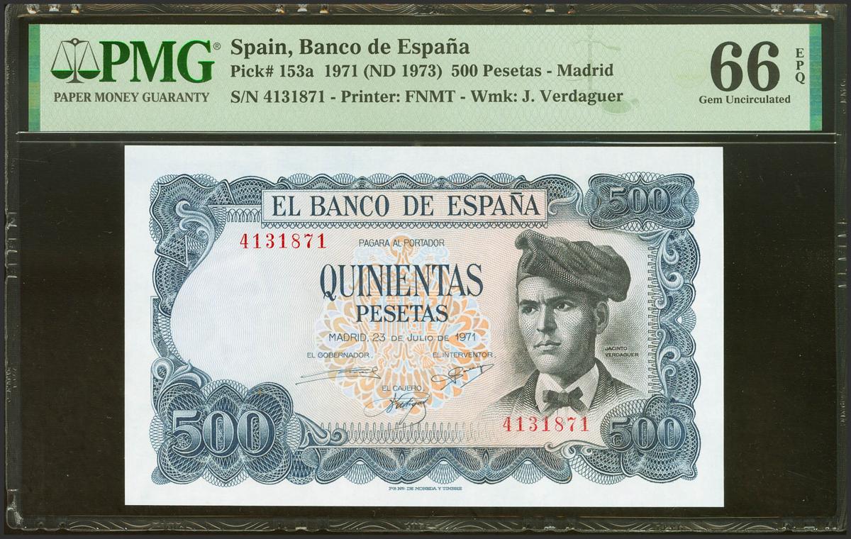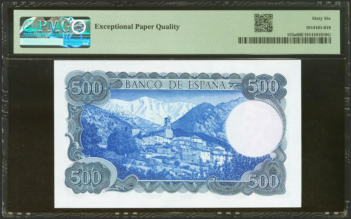 500 Pesetas. 23 de Julio de 1971. Sin serie. (Edifil 2021: 473). Raro en esta calidad, conserva todo su apresto original. Encapsulado PMG66EPQ.