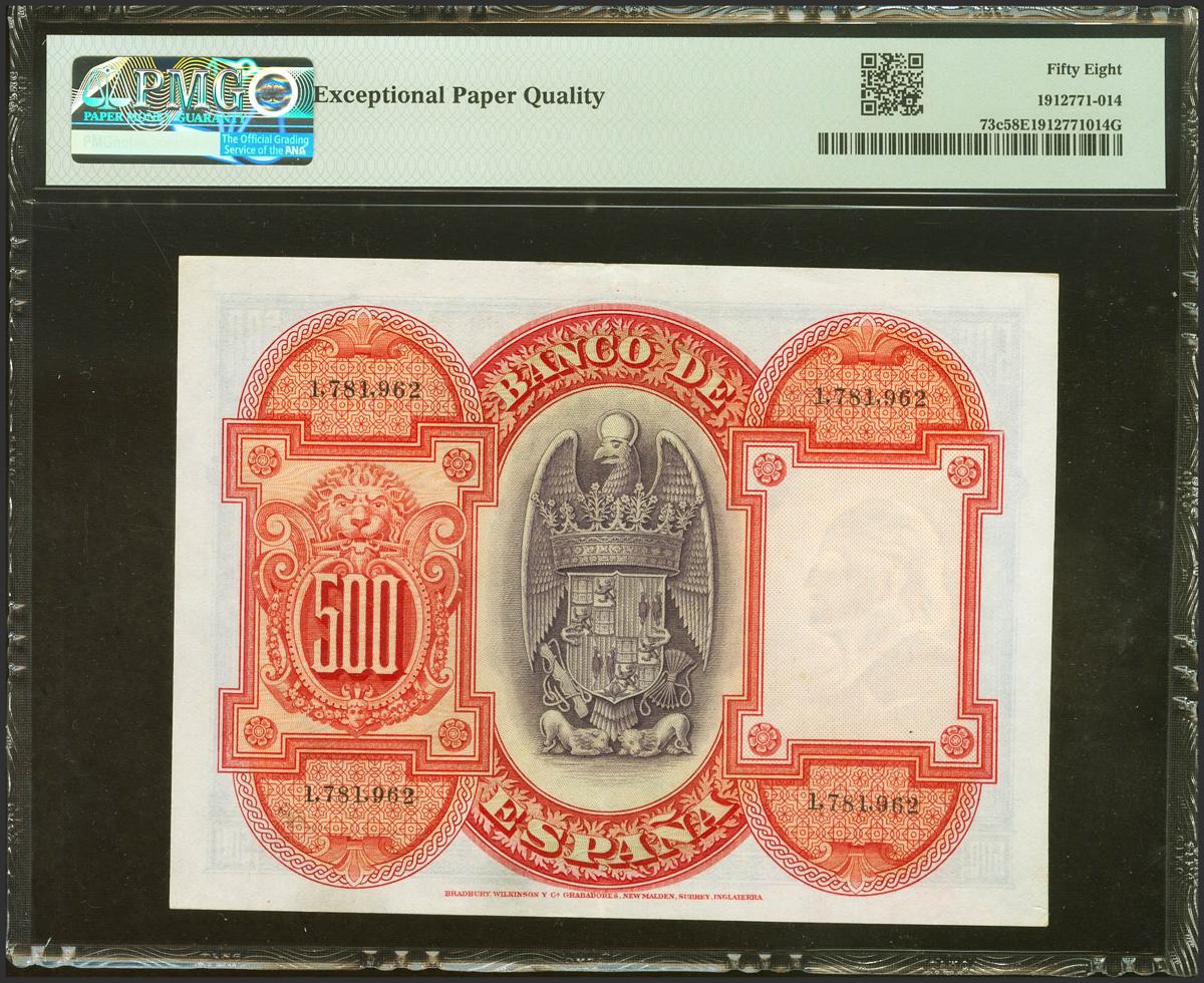 500 Pesetas. 24 de Julio de 1927. Sin serie y numeración posterior 1602000. (Edifil 2021: 352, Pick: 73c). Apresto original. EBC+++. Encapsulado PMG58EPQ.