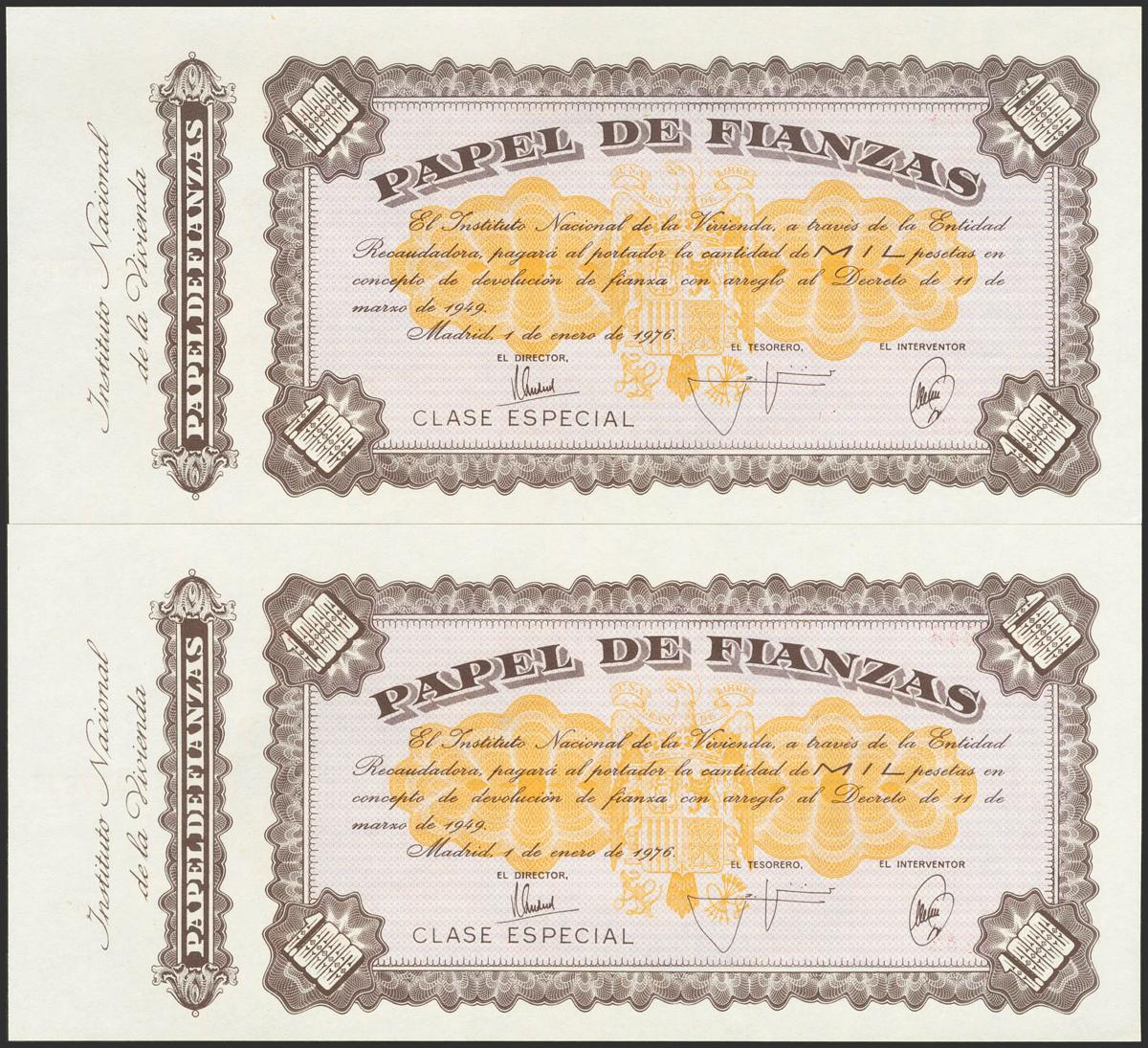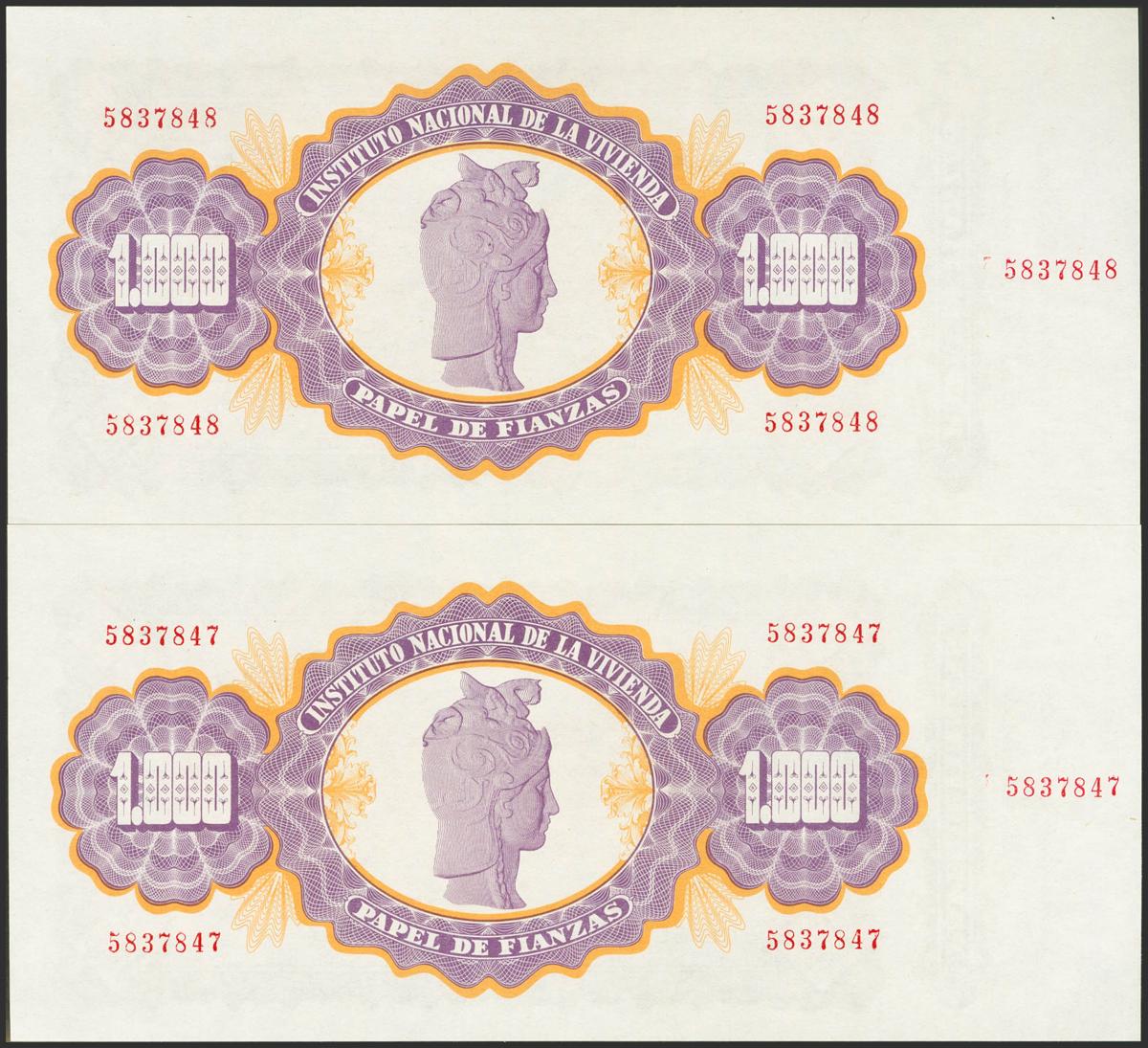 1000 Pesetas. 1 de enero de 1976. Papel de Finanzas. Pareja correlativa. Sin serie y ambos con matriz del Instituto Nacional de la Vivienda. Raro con matriz completa. SC-.