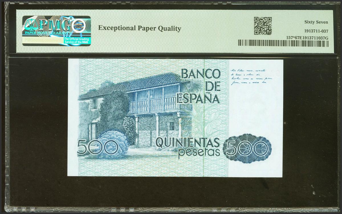 500 Pesetas. 23 de Octubre de 1979. Serie especial 9A. (Edifil 2021: 476b, Pick: 157*). Raro en esta excepcional calidad. SC. Encapsulado PMG67EPQ.