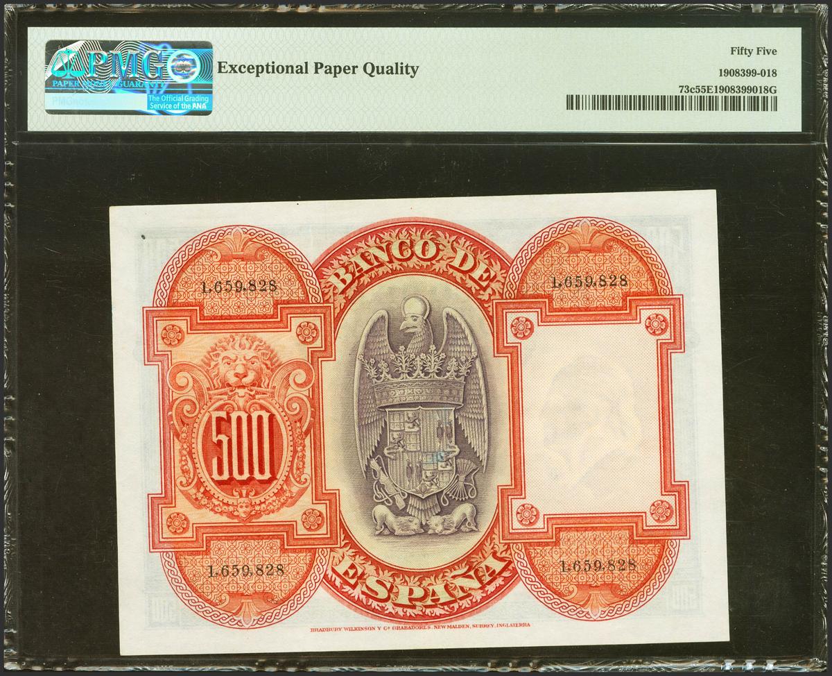 500 Pesetas. 24 de Julio de 1927. Sin serie y numeración posterior al 1602000. (Edifil 2021: 352, Pick: 73c). Inusual en esta calidad, apresto original. EBC+. Encapsulado PMG55EPQ.