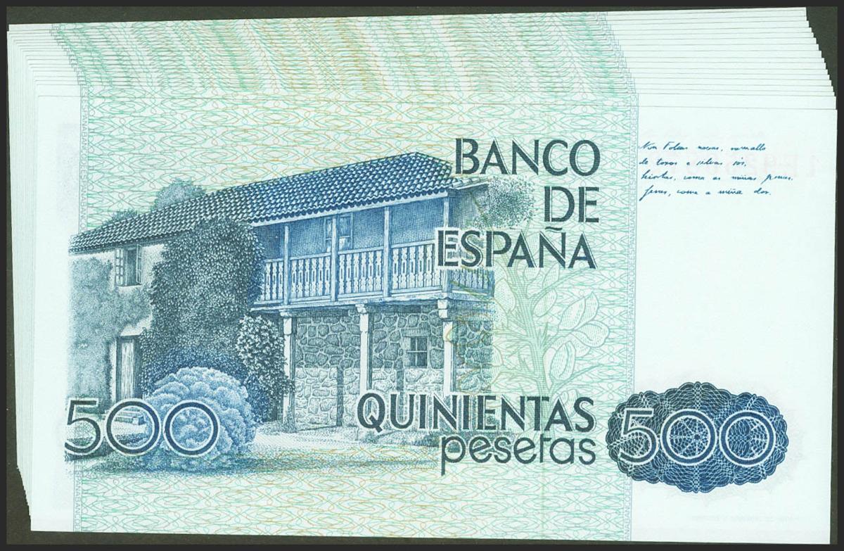 Conjunto de 18 billetes en varios tramos correlativos de 500 Pesetas emitidos 23 de Octubre de 1979, todos ellos con la serie 1E (Edifil 2021: 476a). SC/SC-.