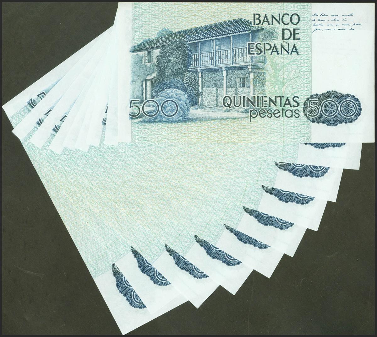 Conjunto de 10 billetes, incluyendo ocho correlativos, de 500 Pesetas emitidos 23 de Octubre de 1979, todos ellos con la serie 1N (Edifil 2021: 476a). SC/EBC+.