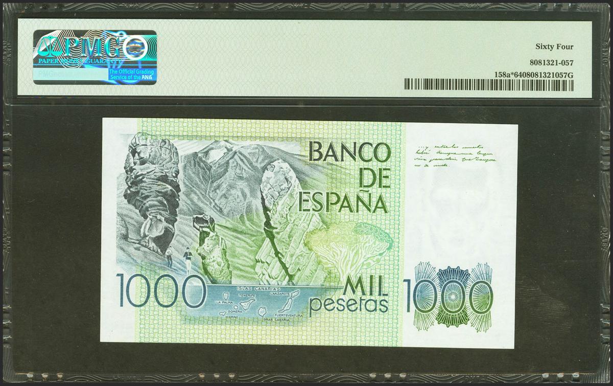 1000 Pesetas. 23 de Octubre de 1979. Serie especial 9E. (Edifil 2021: 477b, Pick: 158a*). Muy rara serie SC. Encapsulado PMG64.