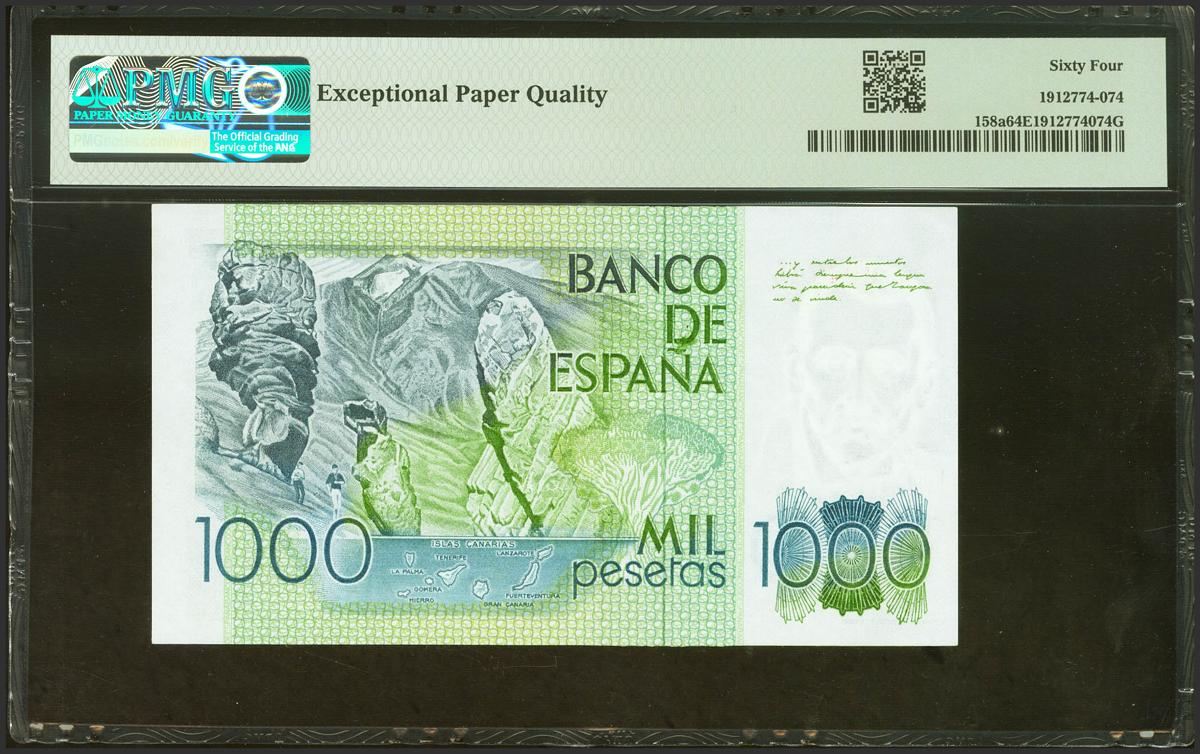 1000 Pesetas. 23 de Octubre de 1979. Sin serie y numeración bajísima. (Edifil 2021: 477, Pick: 158a). SC. Encapsulado PMG64EPQ.