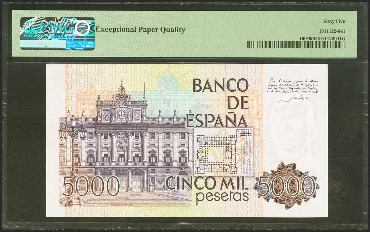 5000 Pesetas. 23 de Octubre de 1979. Serie especial 9E. (Edifil 2021: 478b, Pick: 160*). Raro en esta excepcional calidad. SC. Encapsulado PMG65EPQ.