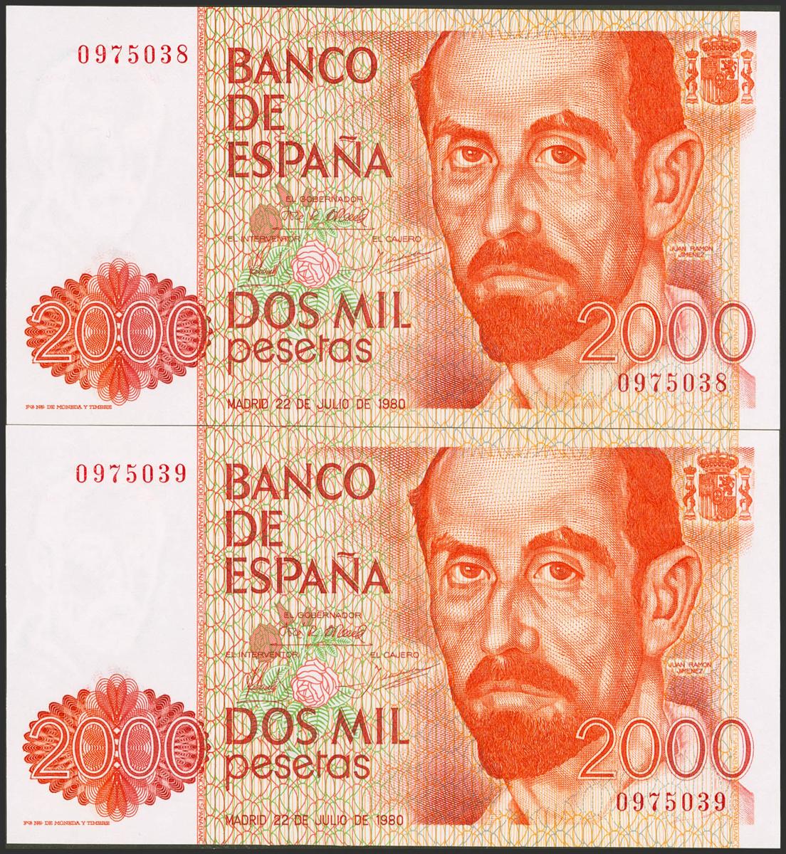 2000 Pesetas. 22 de Julio de 1980. Pareja correlativa. Sin serie. (Edifil 2021: 479). SC.