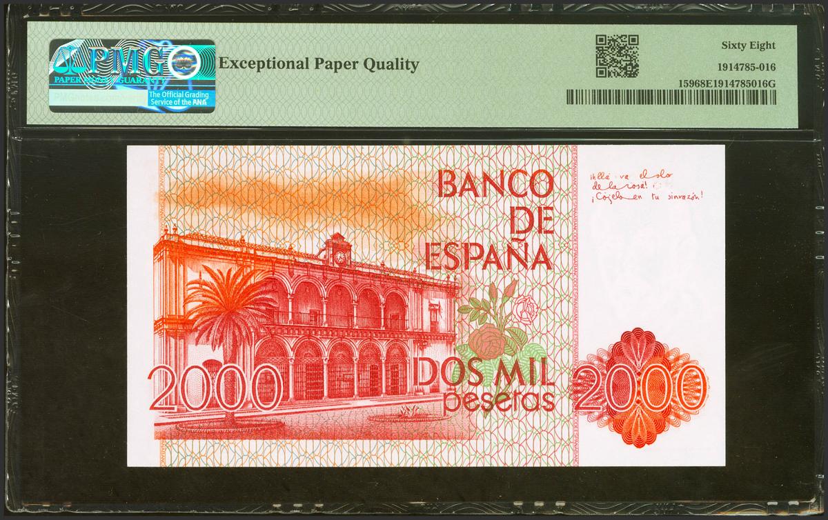 2000 Pesetas. 22 de Julio de 1980. Sin serie. (Edifil 2021: 479, Pick: 159). Rara en esta excepcional calidad. SC. Encapsulado PMG68EPQ.