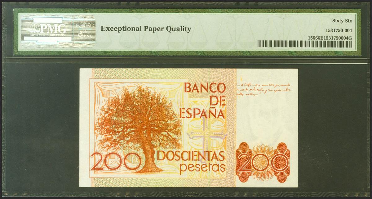 200 Pesetas. 16 de Septiembre de 1980. Serie especial 8B. (Edifil 2021: 480c, Pick: 156exp). Raro en esta excepcional calidad, apresto original. SC. Encapsulado PMG66EPQ.