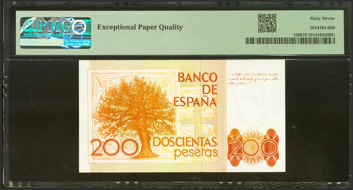 200 Pesetas. 16 de Septiembre de 1980. Sin serie y numeración baja. (Edifil 2021: 480, Pick: 156). SC. Encapsulado PMG67EPQ.