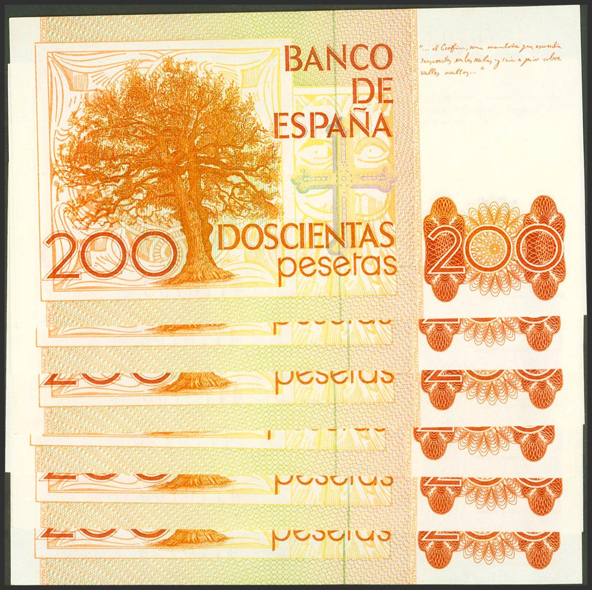 Conjunto de 6 billetes (un trío correlativo, una pareja y uno suelto) emitidos el 16 de Septiembre de 1980, todos ellos sin serie. (Edifil 2021: 480). SC/EBC+++.