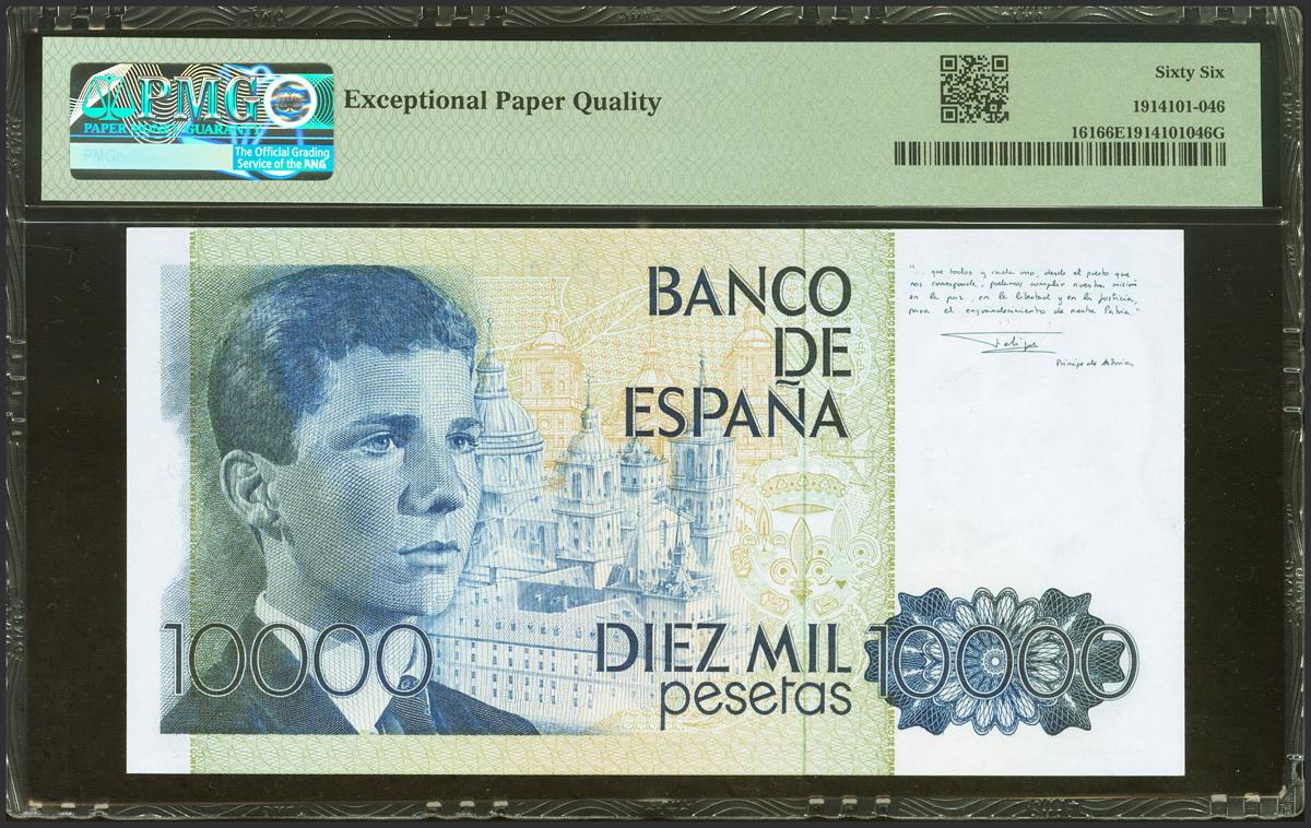 10000 Pesetas. 24 de Septiembre de 1985. Sin serie y numeración muy baja. (Edifil 2021: 481, Pick: 161). Inusual en esta excepcional calidad. SC. Encapsulado PMG66EPQ.