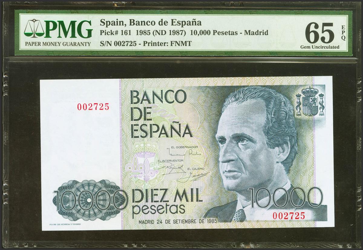 10000 Pesetas. 24 de Septiembre de 1985. Sin serie y numeración muy baja. (Edifil 2021: 481, Pick: 161). Inusual en esta excepcional calidad. SC. Encapsulado PMG65EPQ.
