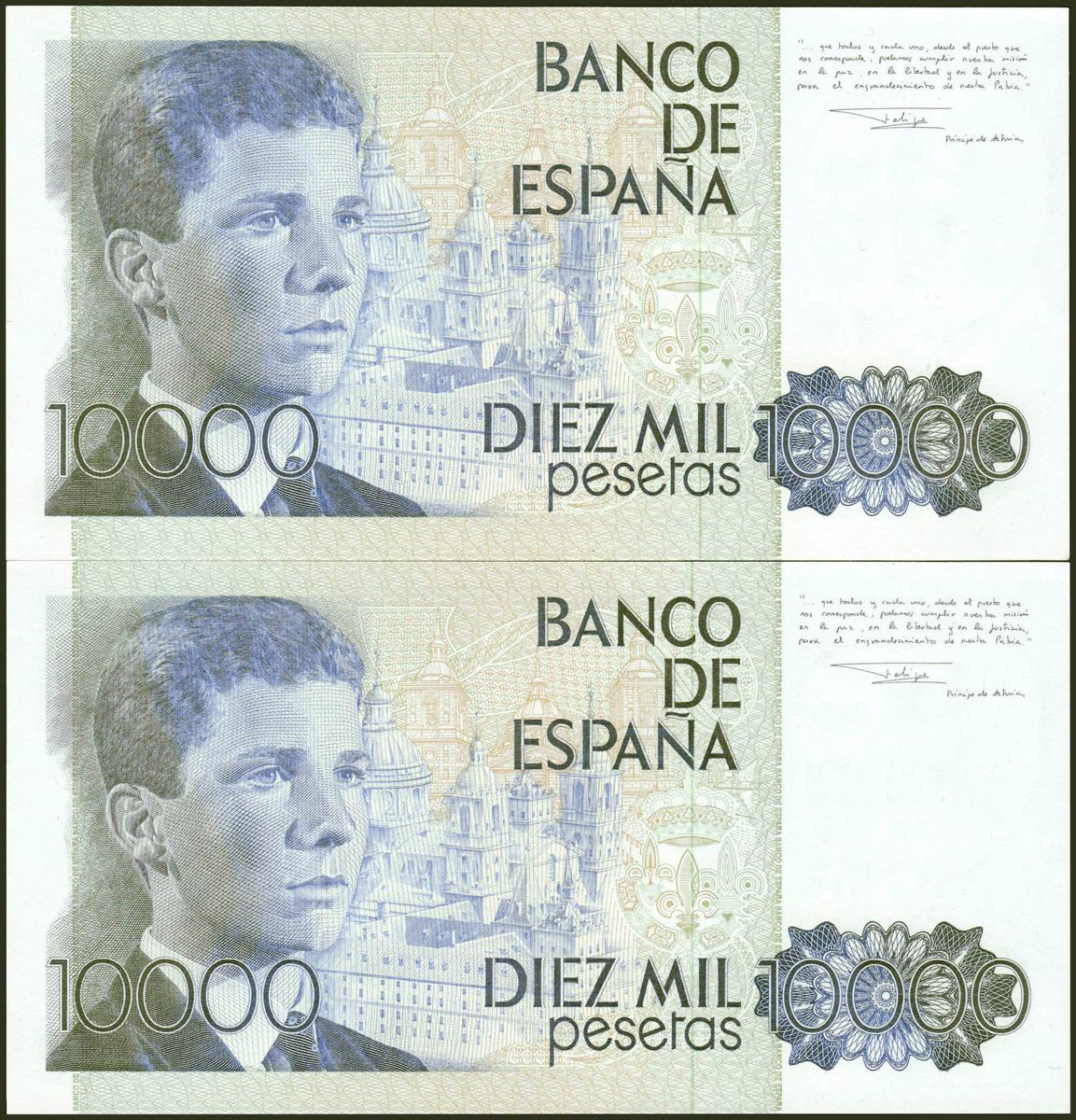10000 Pesetas. 24 de Septiembre de 1985. Pareja correlativa. Sin serie y numeración muy baja. (Edifil 2021: 481). SC-.