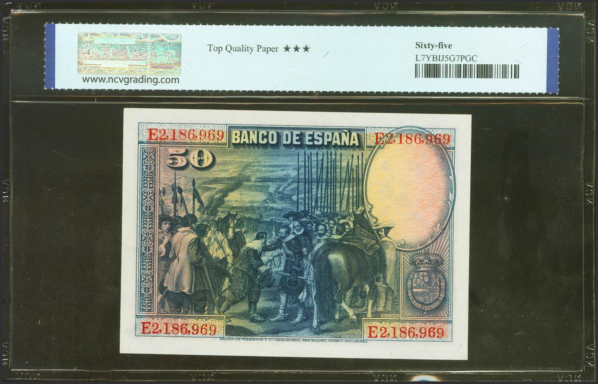 50 Pesetas. 15 de Agosto de 1928. Serie E. (Edifil 2021: 354, Pick: 75b). Apresto original. SC. Encapsulado NCV65TQP.