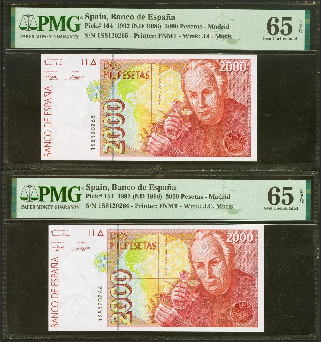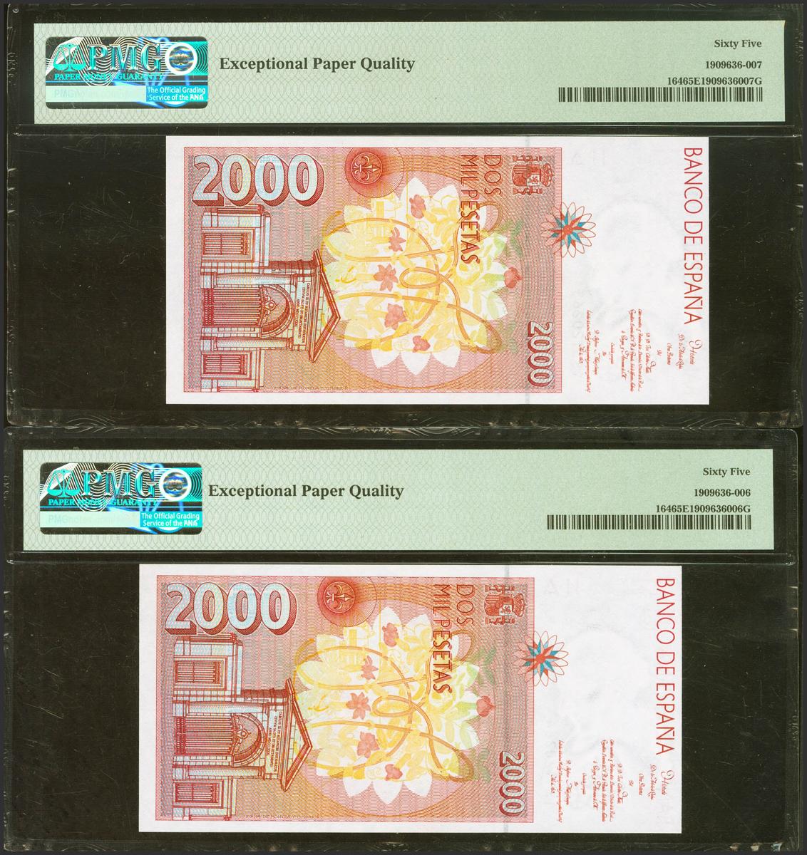 2000 Pesetas. 24 de Abril de 1992. Pareja correlativa. Serie 1S. (Edifil 2021: 482A, Pick: 164). Apresto original. SC. Encapsulados PMG65EPQ, ambos.