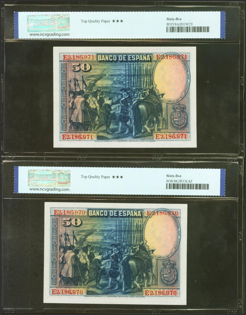 50 Pesetas. 15 de Agosto de 1928. Pareja correlativa. Serie E. (Edifil 2021: 354, Pick: 75b). Apresto original. SC. Encapsulados NCV65TQP, ambos.