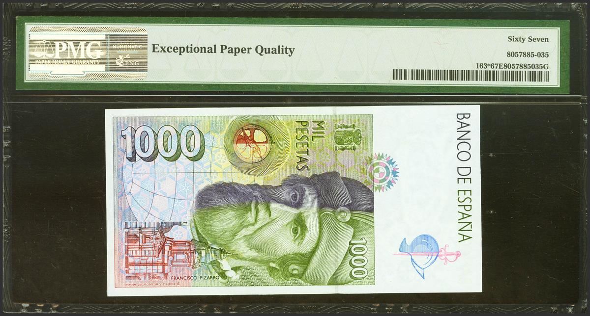 1000 Pesetas. 12 de Octubre de 1992. Serie especial 9A. (Edifil 2021: 483c, Pick: 163*). Inusual en esta excepcional calidad. SC. Encapsulado PMG67EPQ.