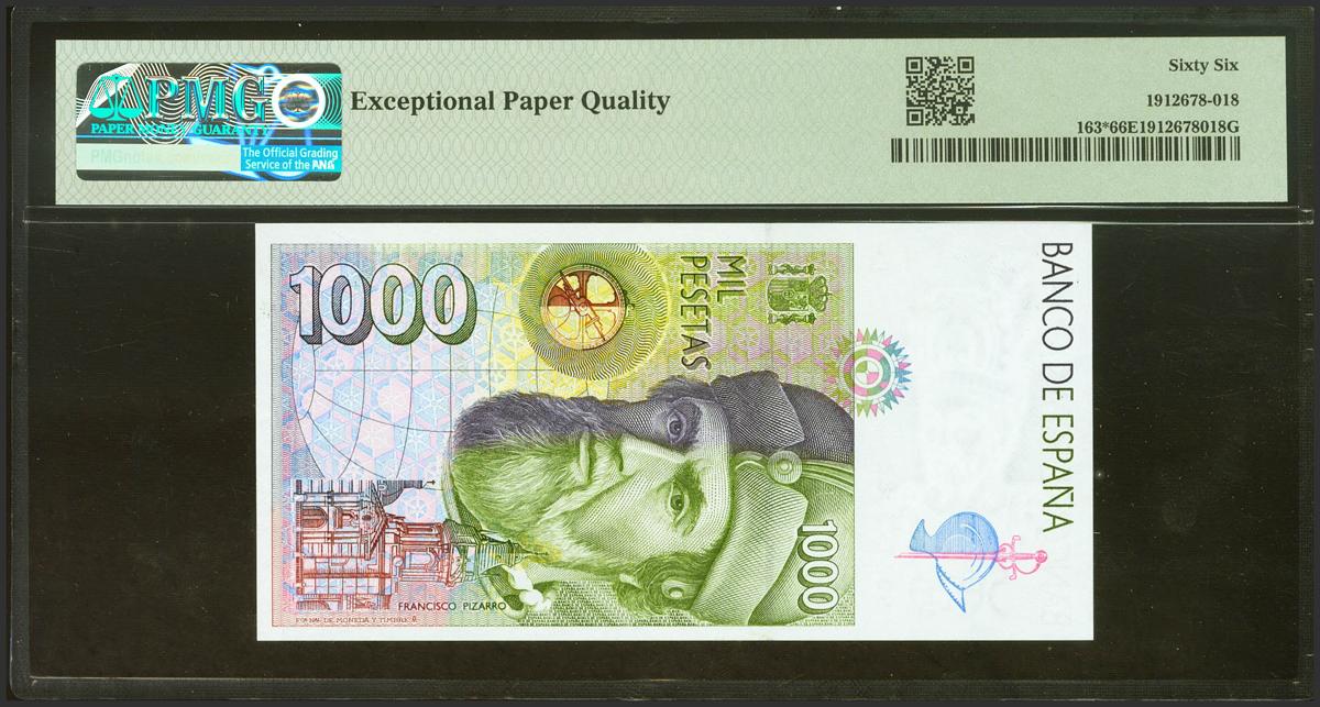 1000 Pesetas. 12 de Octubre de 1992. Serie especial 9B. (Edifil 2021: 483c, Pick: 163*). Raro en esta excepcional calidad. SC. Encapsulado PMG66EPQ.