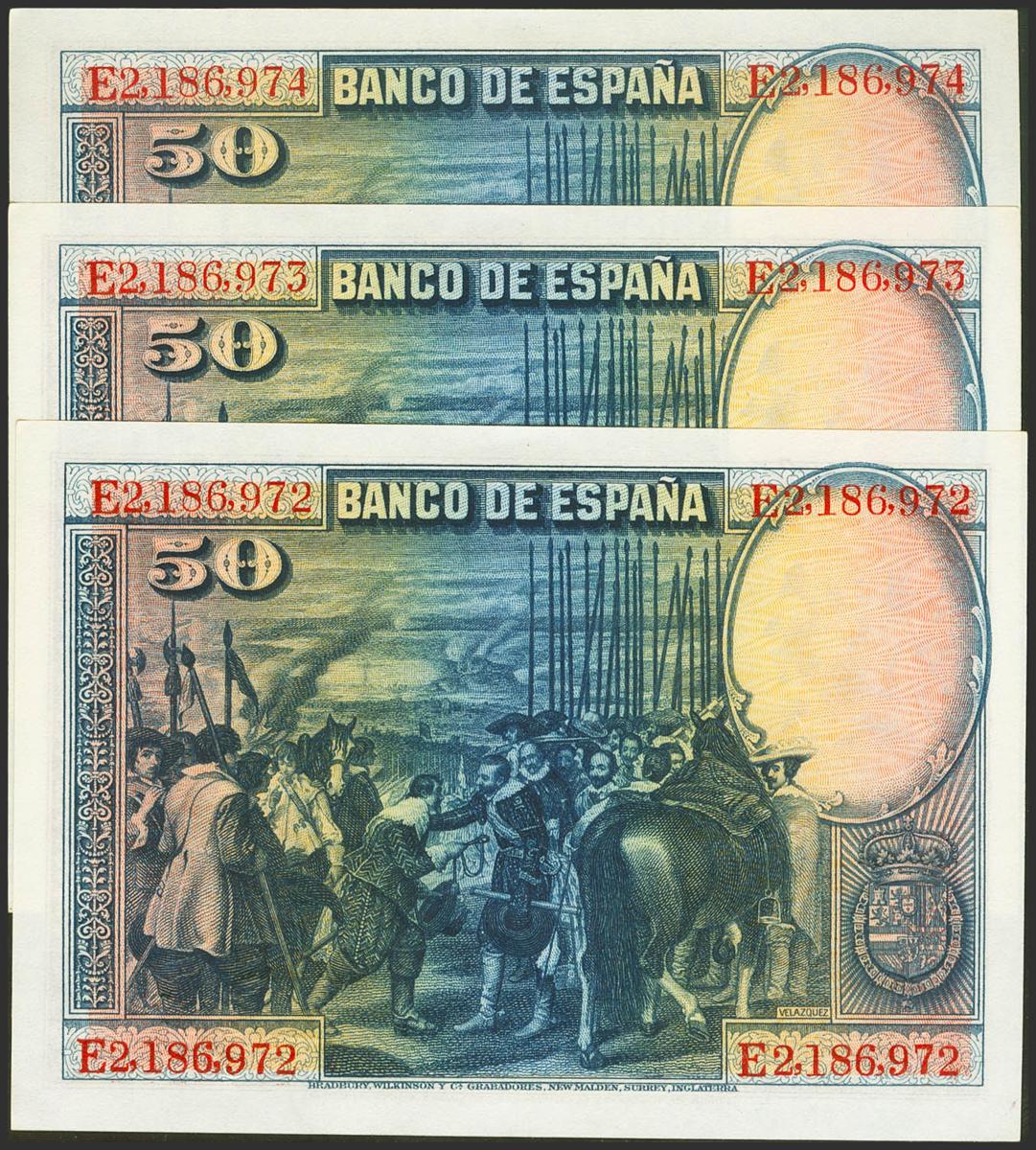 50 Pesetas. 15 de Agosto de 1928. Trío correlativo. Serie E. (Edifil 2017: 354). Conserva todo su apresto original. SC-.