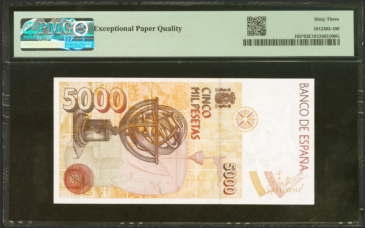 5000 Pesetas. 12 de Octubre de 1992. Serie especial 9A. (Edifil 2021: 484b, Pick: 165*). Raro en esta excepcional calidad. SC. Encapsulado PMG63EPQ.